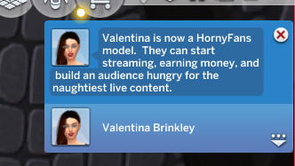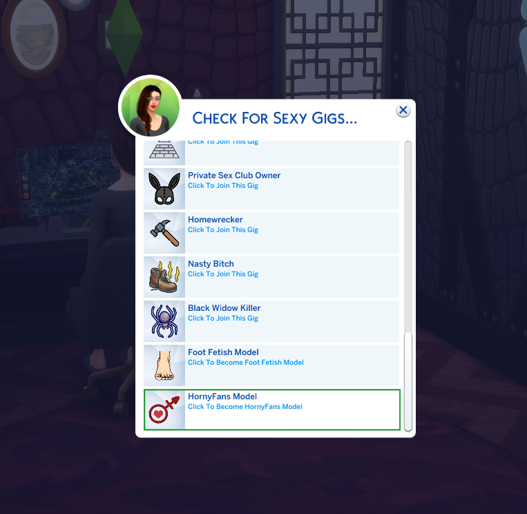 Click on your Sim and select the Sexy Gigs menu. Next click on Check For Gigs. From the list select HornyFans Model.