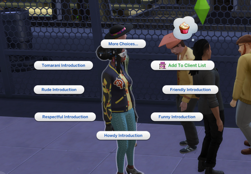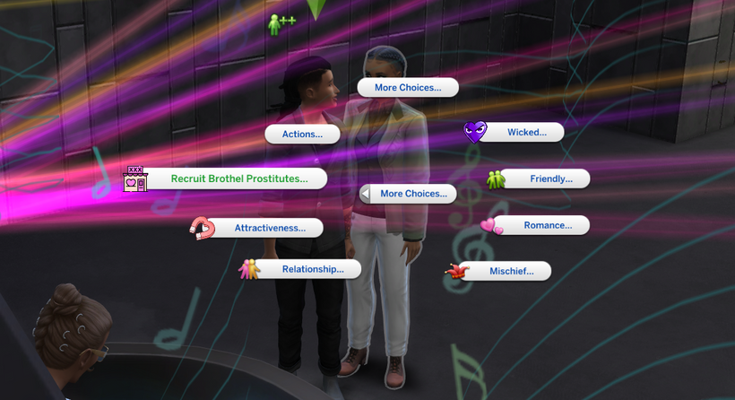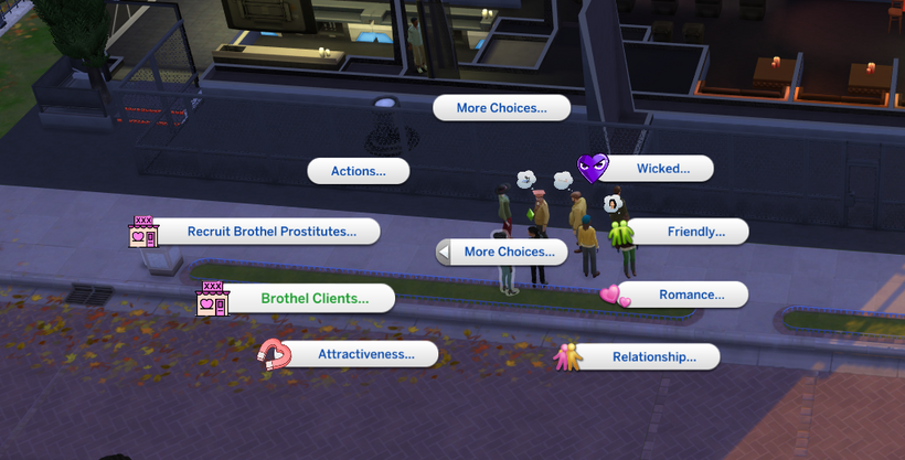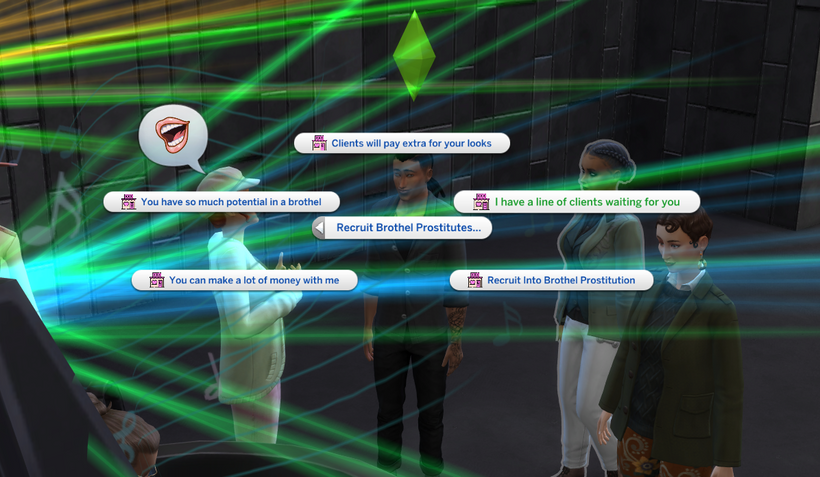 In this example, I’ll head to a nightclub to introduce my Sim to potential workers. Click on a Sim, select the new social menu ” Recruit Brothel Prostitutes”.