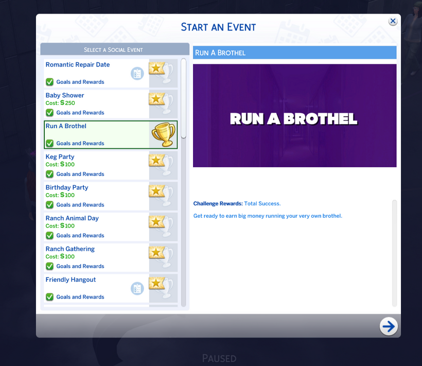 This event will allow you to select your Sim as the Brothel Keeper, at least one worker you’ve recruited, and up to 8 Brothel Sex Buyers.