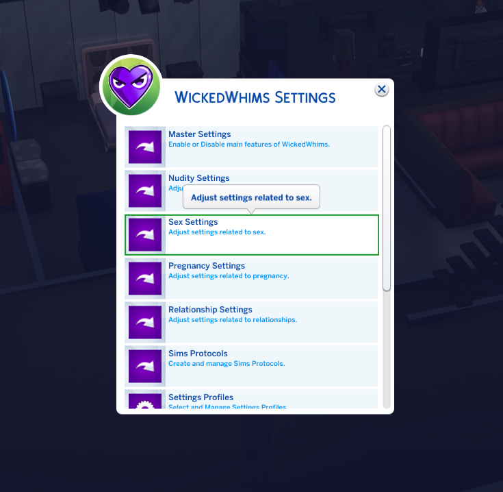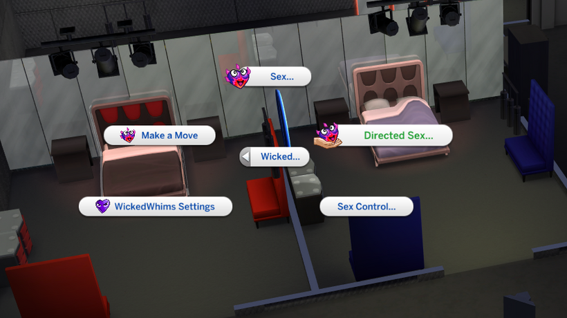 In this example, the brothel room has a double bed. Click on the bed and select wicked whims menu. The Wicked Whims Settings.