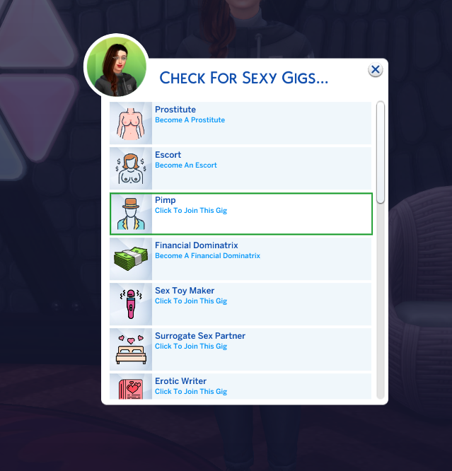 Click on your Sim and select the Sexy Gigs menu. Next click on Check For Gigs. From the list select Pimp.