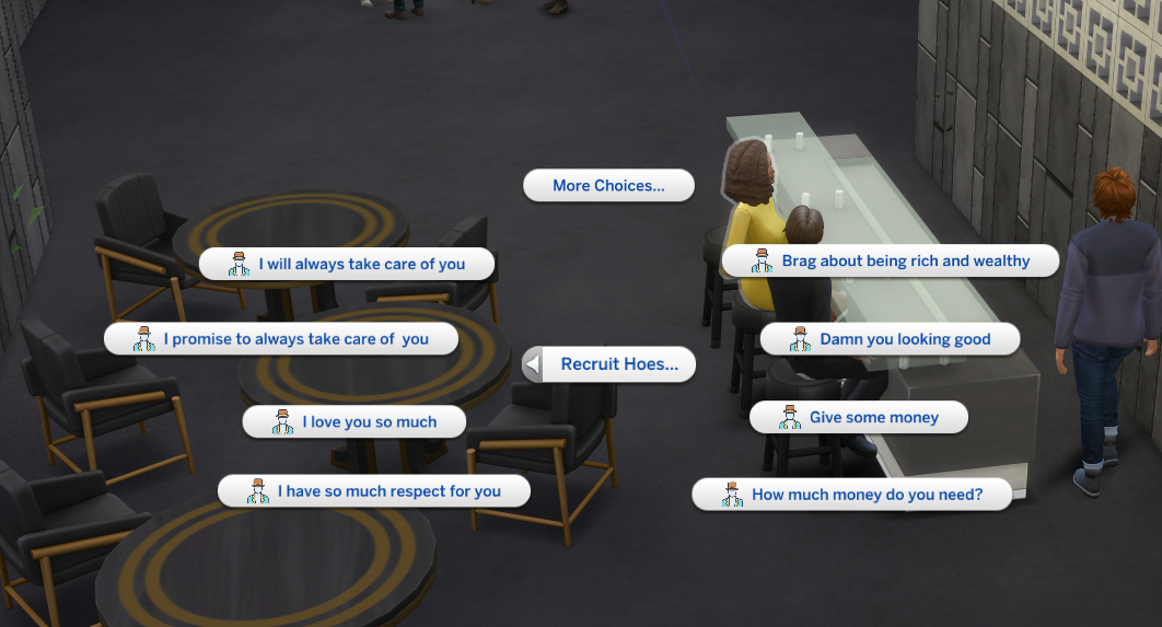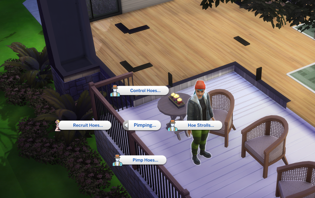The first thing you’ll need to do is recruit some hoes. Click on a Sim you think will make you a lot of money and select the Pimping menu. Next, Recruit Hoes menu.