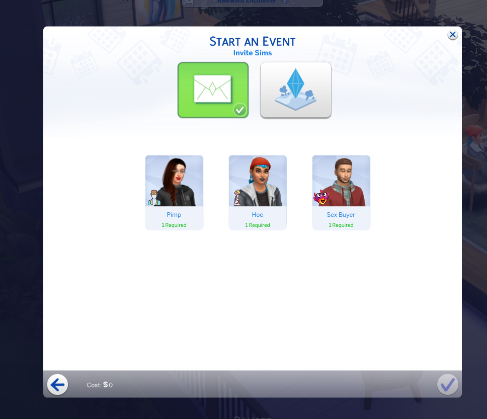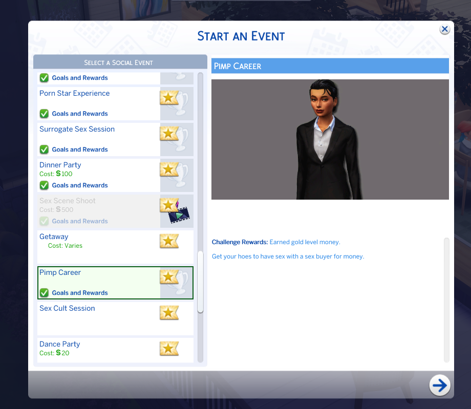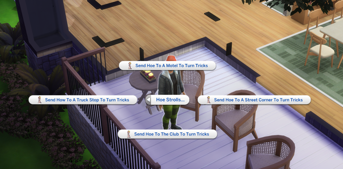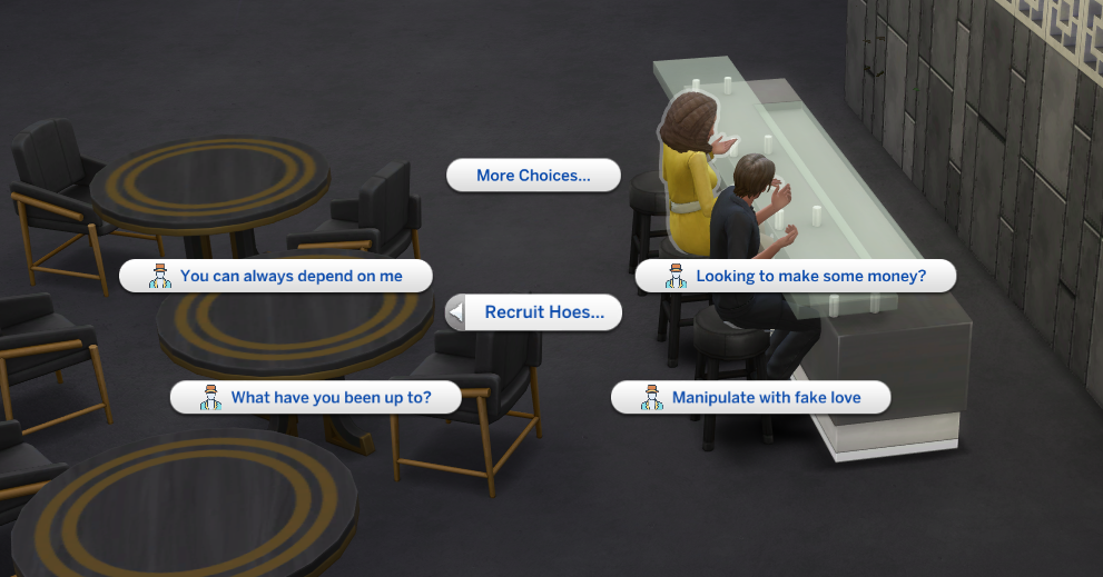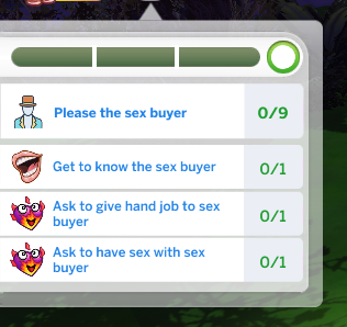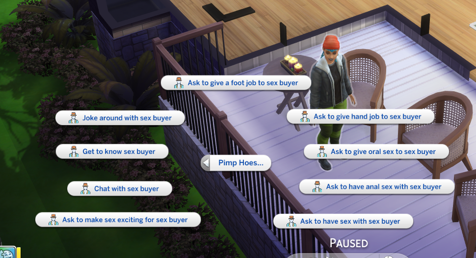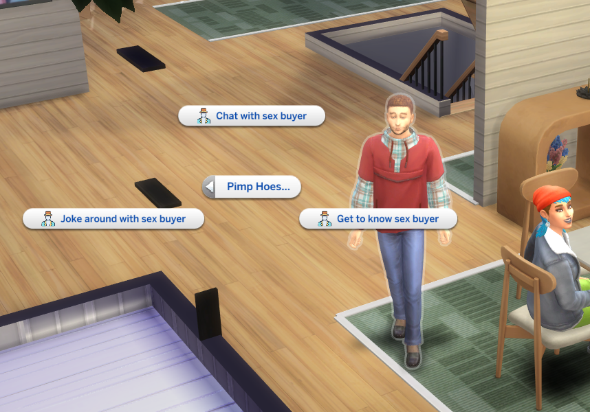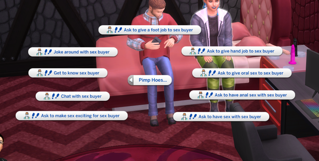 These are interactions used to communicate with the sex buyer and hoe. First use your phone to start an event. Select Pimp Career. Select your Sim as the Pimp, A hoe that works for you, and a random sex buyer.