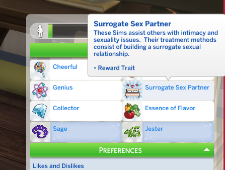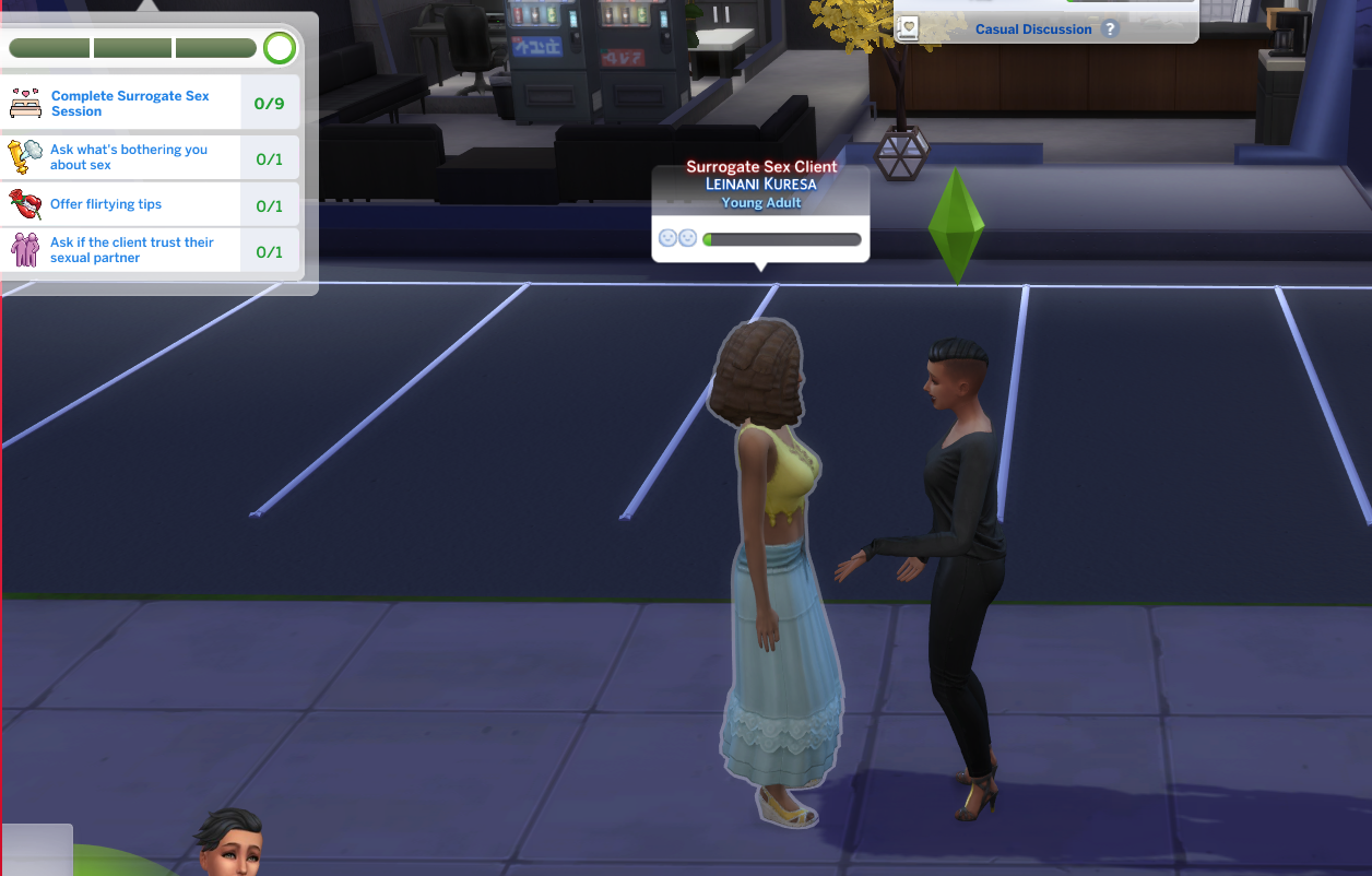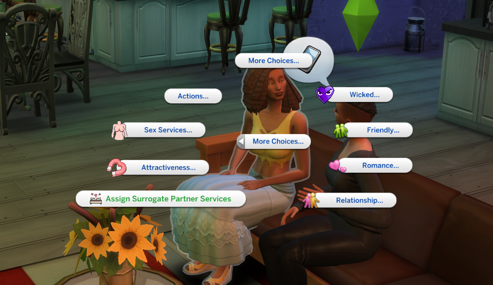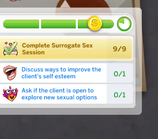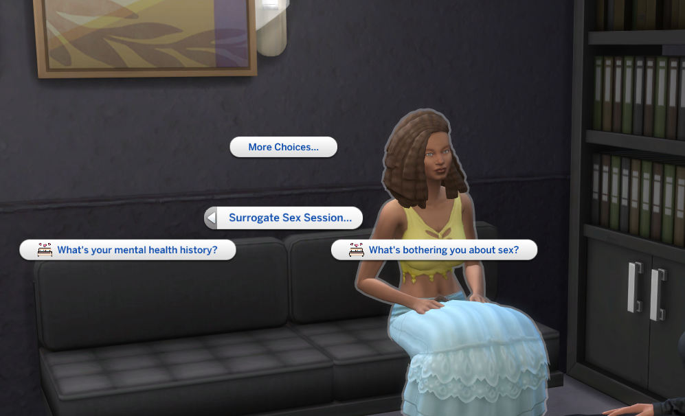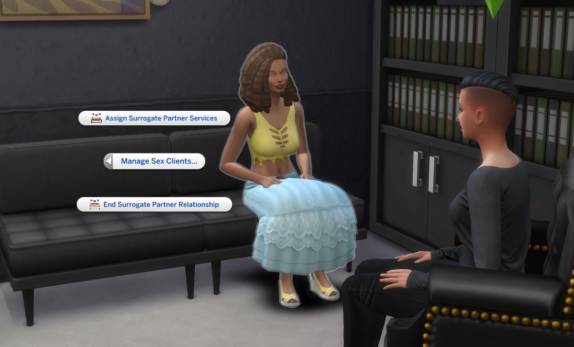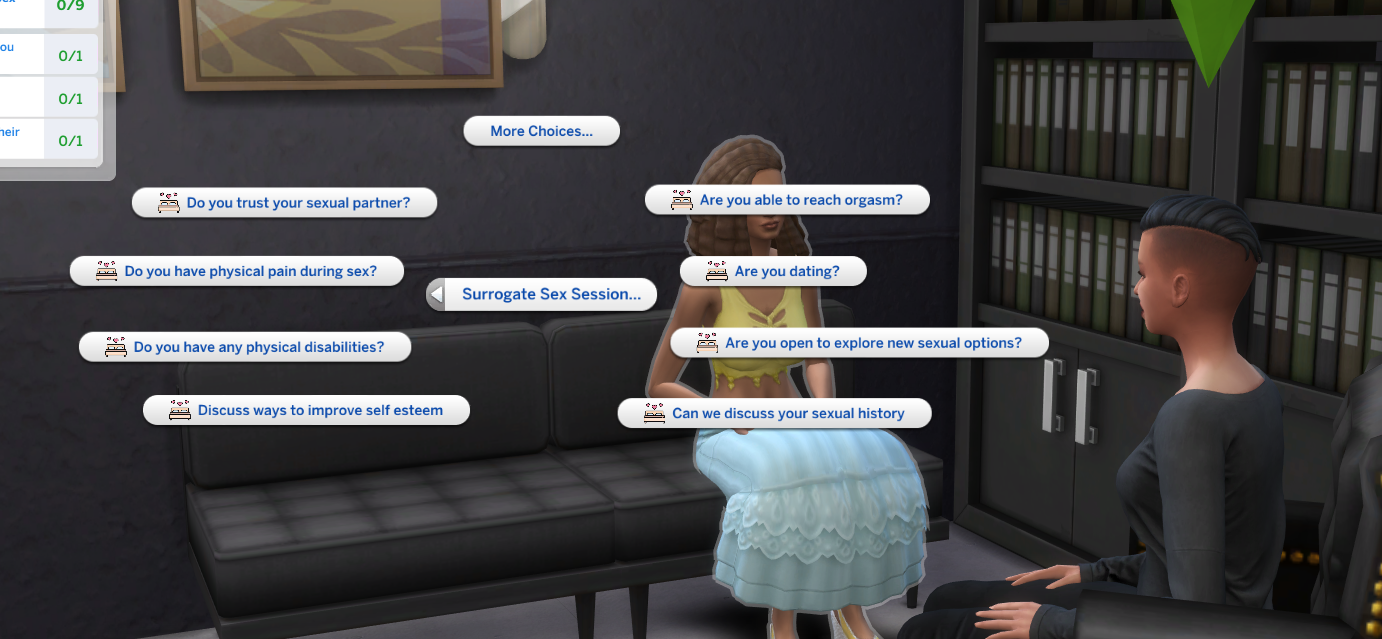 Once the client has the trait they’ll have a new social menu called Surrogate Sex Session. Use this menu to ask questions. The Client will have a response to most questions you ask. There are over 18 questions.