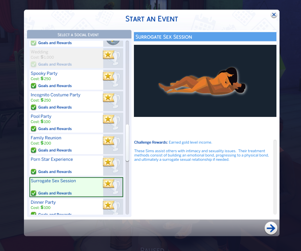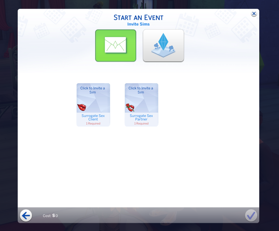 Select the Surrogate Sex Session event. Choose your Sim as the Surrogate Sex Partner and the client as the Surrogate Sex Client.